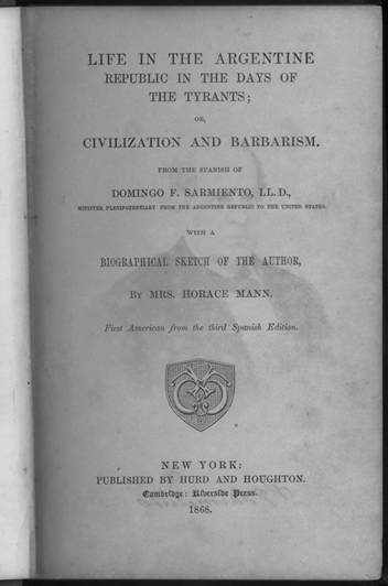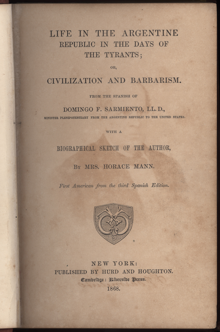The first English language edition by Sarmientos good friend, Mary Mann of Boston, was probably translated from an earlier French edition. Mann and Sarmiento met when he traveled to the United States as a Chilean ambassador to study educational methods in 1847. Mrs. Mann was the wife of Horace Mann, the great American educator.