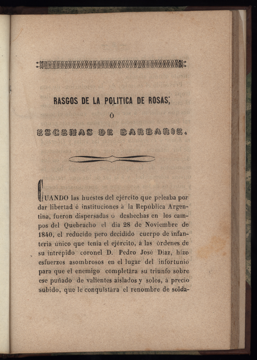 Echeverría wrote this work while in exile in Montevideo, Uruguay. This second edition describes acts of atrocity committed by the Federalists against Unitario prisoners, during the battle of Quebracho in Buenos Aires.